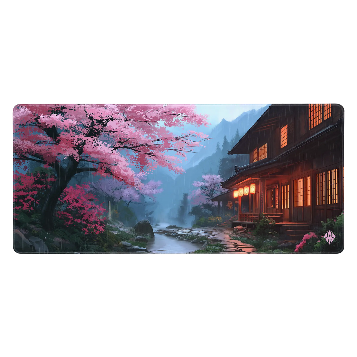 The Sakura Village mousepad captures the atmosphere of a tranquil Japanese mountain village during a gentle spring rain. The warm glow of lanterns reflects off the wet stones, while cherry blossoms line the path. This design evokes a natural home, bringing a sense of security and tranquility to any workspace. A mousepad that encourages focus and tranquility.